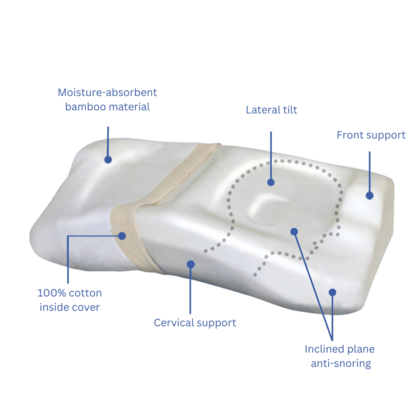 The Posiform anti-snoring pillow treats this common problem by gently encouraging a lateral sleeping posture.