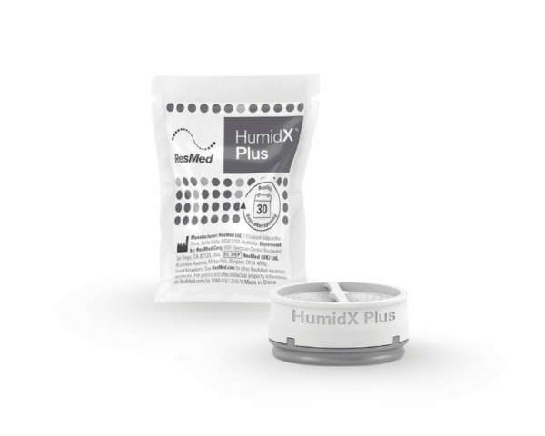 HumidX Plus puede insertarse directamente entre el conector de la mascarilla y el dispositvo, lo que proporciona una humidificación sin agua efectiva a un nivel compacto, efectivo y cómodo. Tenga en cuenta que cada HumidX Plus dura 30 días una vez que se ha abierto el embalaje. El HumidX estándar de ResMed también está disponible para niveles de humedad más normales / promedio.