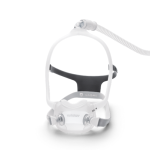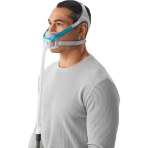A máscara de terapia CPAP AirFit P30i com almofada nasal da ResMed apresenta um design de tubo na parte superior da cabeça. Esta máscara é silenciosa e estável, permitindo que você durma confortavelmente em qualquer posição.